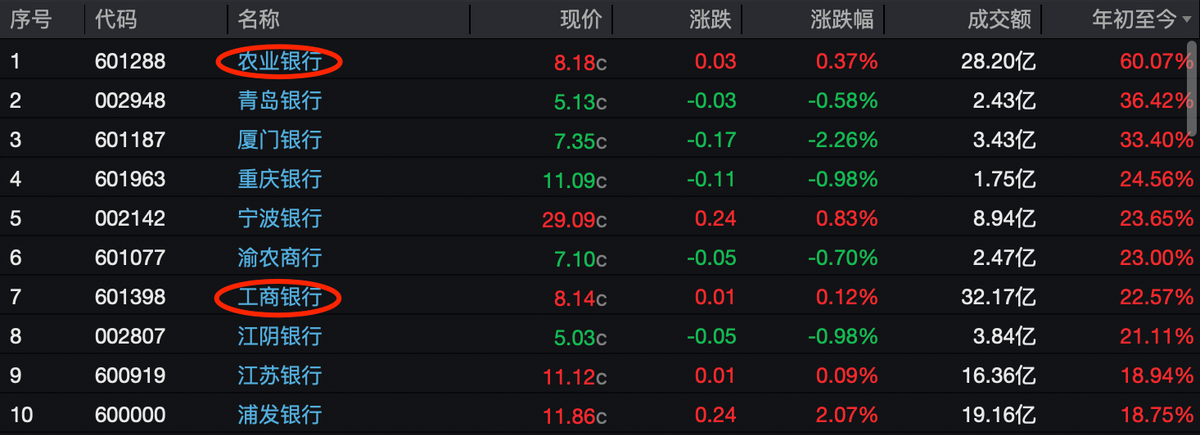 截至11月5日收盘,六大行年初至今的股价涨幅排名依次为农业银行(60.07%)、工商银行(22.57%)、建设银行(12.92%)、邮储银行(9.16%)、中国银行(7.87%)、交通银行(-0.60%)。