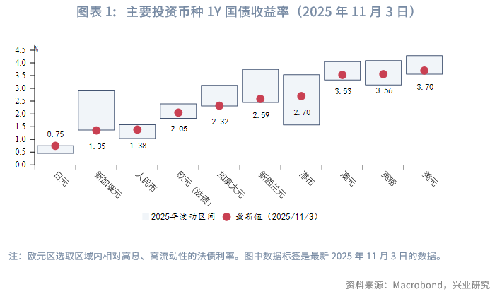 我们选取各币种1年期国债/公债收益率作为存款收益的横向比较基准。欧元选取区域内相对高息、高流动性的法债利率。截至2025年11月3日,本外币存款利息回报的排序是美元>英镑>澳元>港币>新西兰元>加元>欧元>人民币>新加坡元>日元。其中美元、英镑、澳元的利息回报高于3.5%,其余币种低于3%。港币目前利率仅次于美元、英镑、澳元,但2025年年内波动较大。