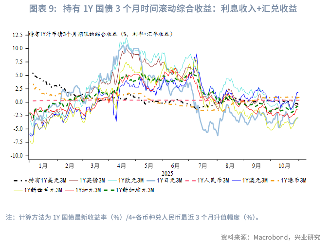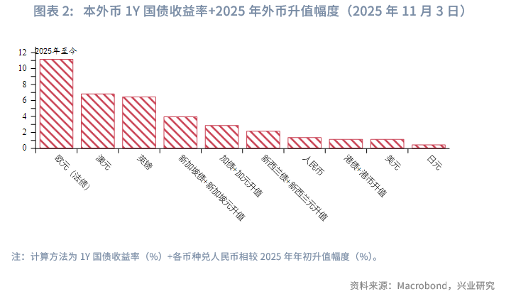 以上为纯息收入,倘若考虑汇率变动,则外币存款的排序将出现较大的变化。我们将“2025年年内各币种相对人民币的升值幅度”与1年期各币种国债收益率加总,可以得到包含汇兑损益在内的外币存款总收益,该收益受到利率变动和汇率变动的双重影响。