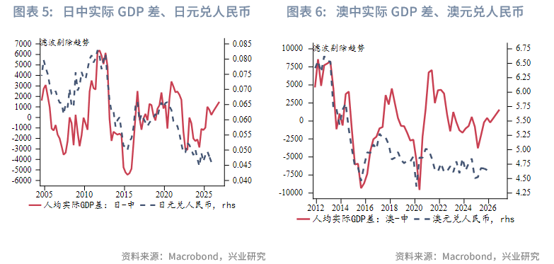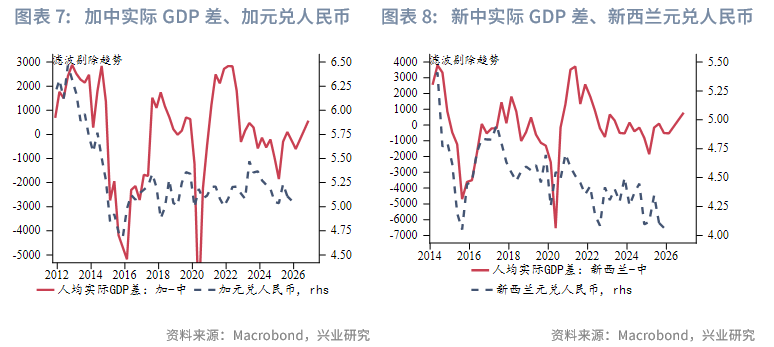 我们在报告《兴业研究汇率报告:以劳动生产率视角预测主要货币对走势20251022》中从巴拉萨-萨缪尔森效应出发,以实际人均GDP作为劳动生产率的替代指标,运用OECD对人均GDP的预测,给出未来1年主要币种兑人民币的方向预测。结论是未来1年兑人民币升值潜力由强到弱的币种依次是:日元、加元、澳元、新西兰元>美元>欧元、英镑。