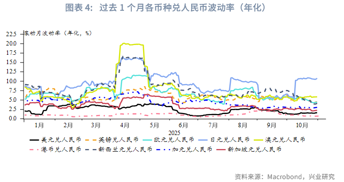 再来看汇率变动,汇率市场波动往往较利率市场更加剧烈,意味着汇兑损益在外币存款总收益中的比重可能超过利率的贡献。从2025年的表现来看,日元是波动最剧烈的货币;其次是澳元、新西兰元和欧元、英镑,波动率都曾阶段性超越日元;加元、新加坡元、美元和港币兑人民币波动率要小于上述货币。
