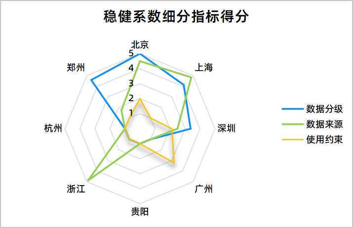 “稳健系数”评分由数据分级、数据来源和使用约束三个核心维度构成,本月整体得分从上月的1.99提升至2.29,显示各数据交易机构在数据合规安全方面取得进展。从各机构得分情况来看,头尾差距明显,中部呈追赶态势。在“数据分级”维度,北京以5分独占鳌头,郑州(4.59分)、上海(4.13分)位居其次,而广州、贵阳、浙江、杭州四家数据交易所均仅得1.00分,在数据分级管理上亟待突破。“数据来源”维度成为本月提升最为显著的细分指标,浙江大数据交易中心从上月2.77提升至4.88分,而广州、贵阳、杭州三家机构仍维持1分,其数据来源的合规链路仍需完善。在“使用约束”上,广州以3.22分脱颖而出,有效提升了数据使用过程中的安全性与隐私保护水平。值得注意的是,贵阳和杭州两地交易所在稳健系数三个细分指标上均取得最低分,反映合规链路的安全性建设滞后,应加快建立数据分级体系和使用约束机制,全面提升数据交易的稳健水平。