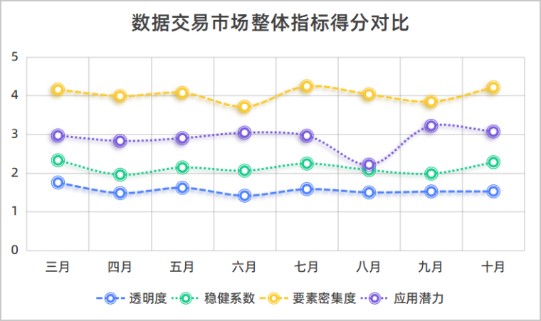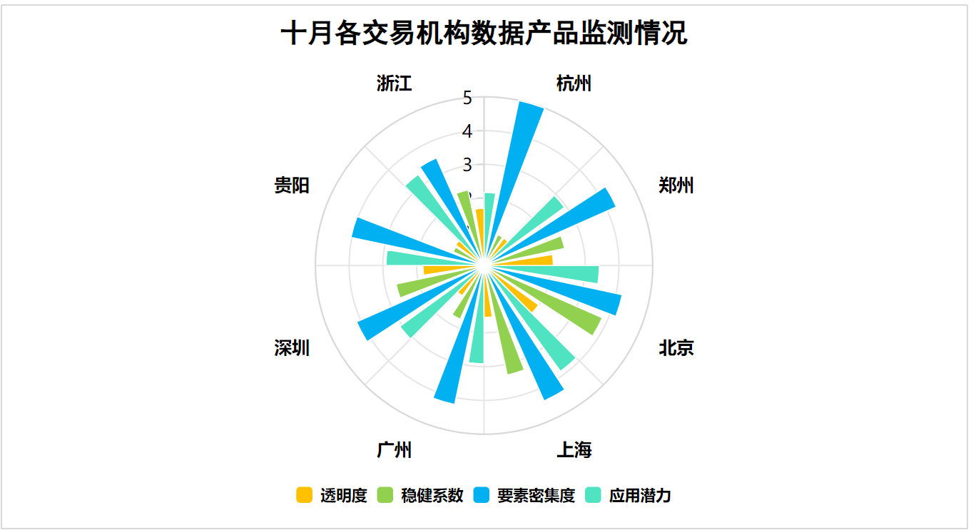 整体来看,十月各大数据交易机构上架产品的核心指标表现较为稳定,稳健系数与要素密集度有所提升,反映出市场合规性与综合性持续增强,应用潜力得分在快速上升后回落、透明度指标长期在低位徘徊,反映出市场热度下降以及定价体系透明度不足等问题明显。未来需在巩固产品合规安全的基础上,进一步提升交易市场活跃度和信息披露度。
