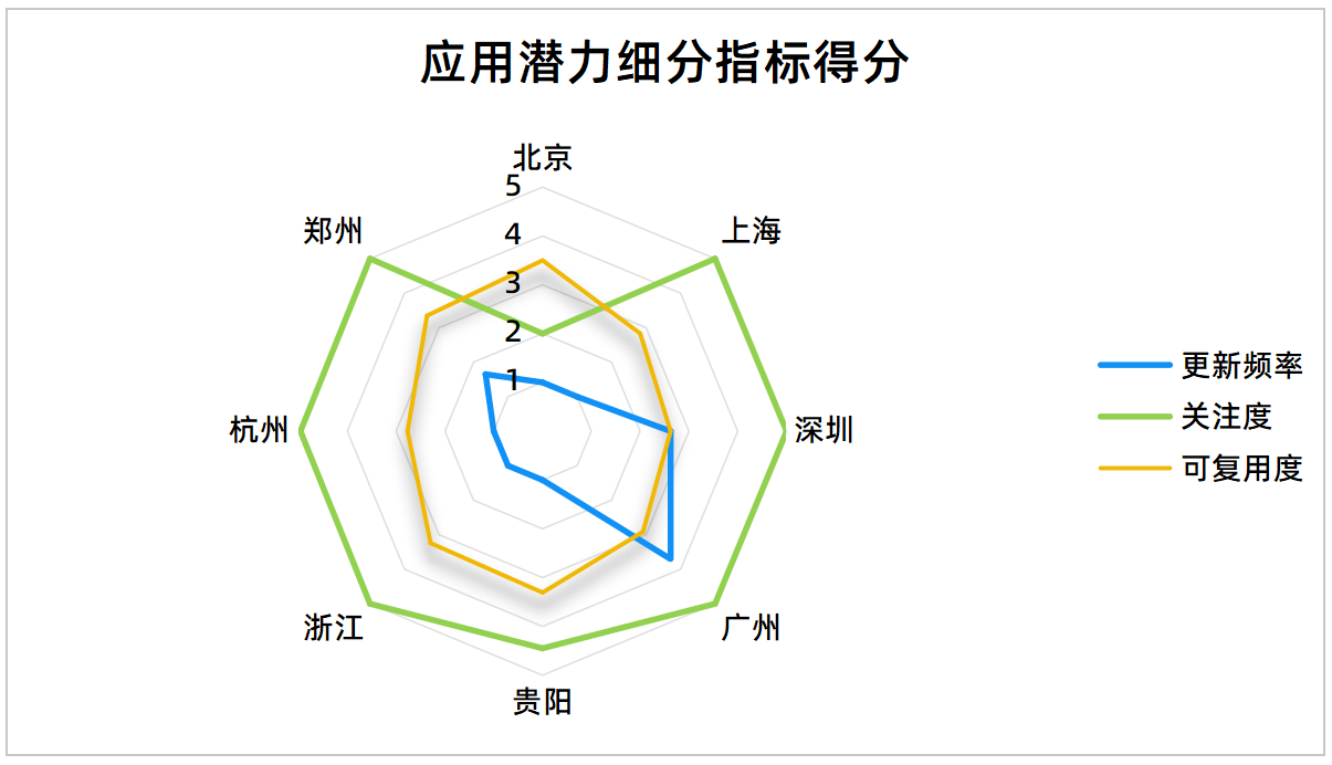 “应用潜力”评分指标主要衡量数据产品市场适配性与增长弹性,由“更新频率”“关注度”与“可复用度”三项细分指标形成。本月,各大数据交易机构该项得分由上月3.23小幅回落至3.08。从“更新频率”来看,多数交易机构维持在1.00分值,上新的数据产品尚未形成定期维护的运作模式。“关注度”反映数据产品的市场曝光与交易热度。本月除北京国际大数据交易所外,其余样本数据交易机构均维持上月良好表现。北京国际大数据交易所“关注度”得分由4.70 骤降至2.00,降幅超57%。或是由于,北京国际大数据交易所本月上新数据产品数量较少,在一定程度上放大了短期个别样本变动对总体评分的影响。“可复用度”评分本月小幅走高。其中,浙江大数据交易中心评分上升0.65,实现样本机构中最大增幅。数据分析显示,本月多数数据交易机构呈现“高更新频率+高关注度”的发展格局,支撑“应用潜力”维度整体表现。未来各数据交易机构还需以市场需求为导向优化服务供给,加强数据产品常态化更新,以实现数据产品的高效流通与规模化应用。