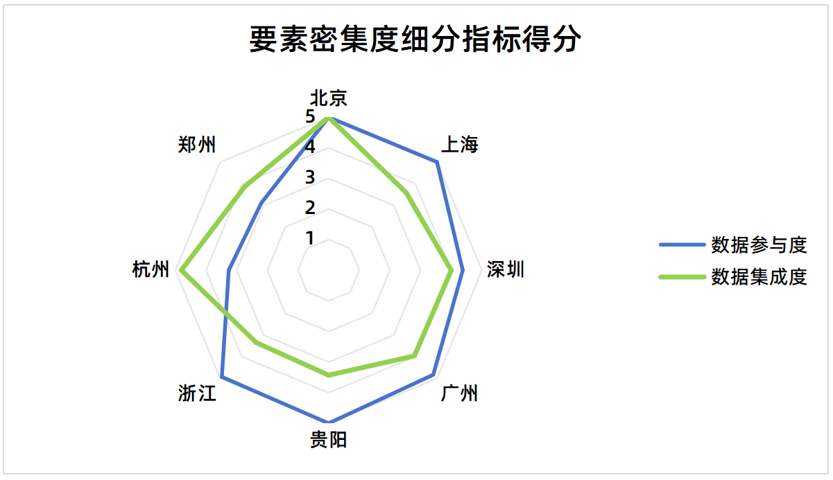 “要素密集度”是测评体系的关键维度,涵盖了“数据参与度”和“数据集成度”两个子指标。测评结果显示,本月数据产品要素密集度得分4.22,较9月涨幅9.6%,两个子指标波动幅度收敛,各数据交易机构发展差距缩小。在“数据参与度”方面,各大数据交易机构整体表现稳健。除郑州数据交易中心外,其余机构得分均有程度不等的提升。其中,杭州数据交易所由9月低位(2.31)显著回升至4.03。在“数据集成度”方面,多数机构发展态势稳中向好。北京国际大数据交易所得分为样本机构中最高,形成“高参与、高集成”的领先格局;上海数据交易所与贵阳大数据交易所虽在“数据参与度”上表现突出,但在“数据集成度”上相对不足,仍需加强多源数据融合、字段类型与结构优化等。综合来看,短期内“数据参与度”对“要素密集度”的贡献度最高,以数据为核心驱动的数据产品研发模式,有助于提升数据产品要素密集度水平,应继续强化数据在产品开发中的主导作用。