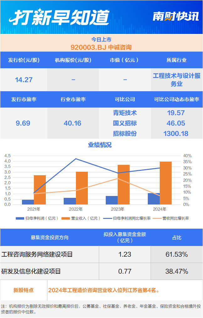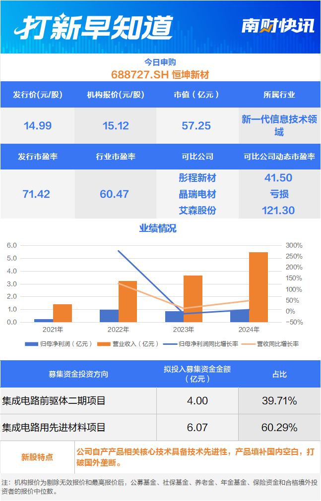 11月7日,有两只新股申购,分别是科创板的恒坤新材(688727.SH),以及创业板的南网数字(301638.SZ);另有两只新股上市,为沪市主板的德力佳(603092.SH),以及北交所的中诚咨询(920003.BJ)。