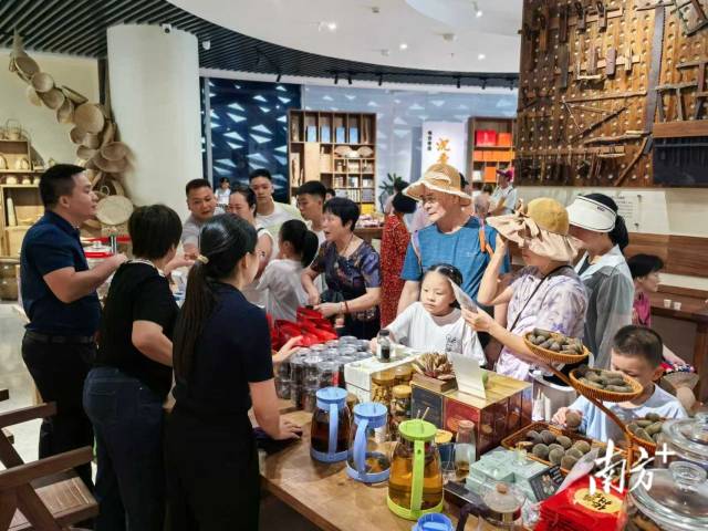 顾客在柏桥服务区非遗手作坊挑选化橘红产品。 受访者供图