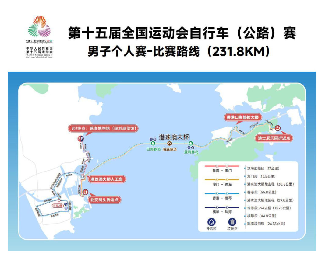 本次公路自行车男子个人赛赛程231.8公里,分为四段——香港段55.8公里、澳门段13.5公里、珠海段117.7公里、横琴段44.8公里,选手6次穿越三地口岸,全程无间断骑行。 这场赛事创下了全运会史上赛道最长、跨境次数最多的纪录。