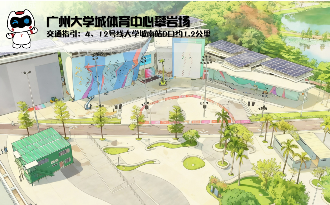 简介 :广州大学城体育中心位于番禺区,攀岩场设约1500个临时座位,新建1-5号临建功能建筑、速度道岩壁构筑物、抱石道岩壁构筑物及热身场等,同时完善赛场基础设施功能,达到承办国际攀岩赛事比赛要求,承办十五运会竞体项目攀岩赛事。