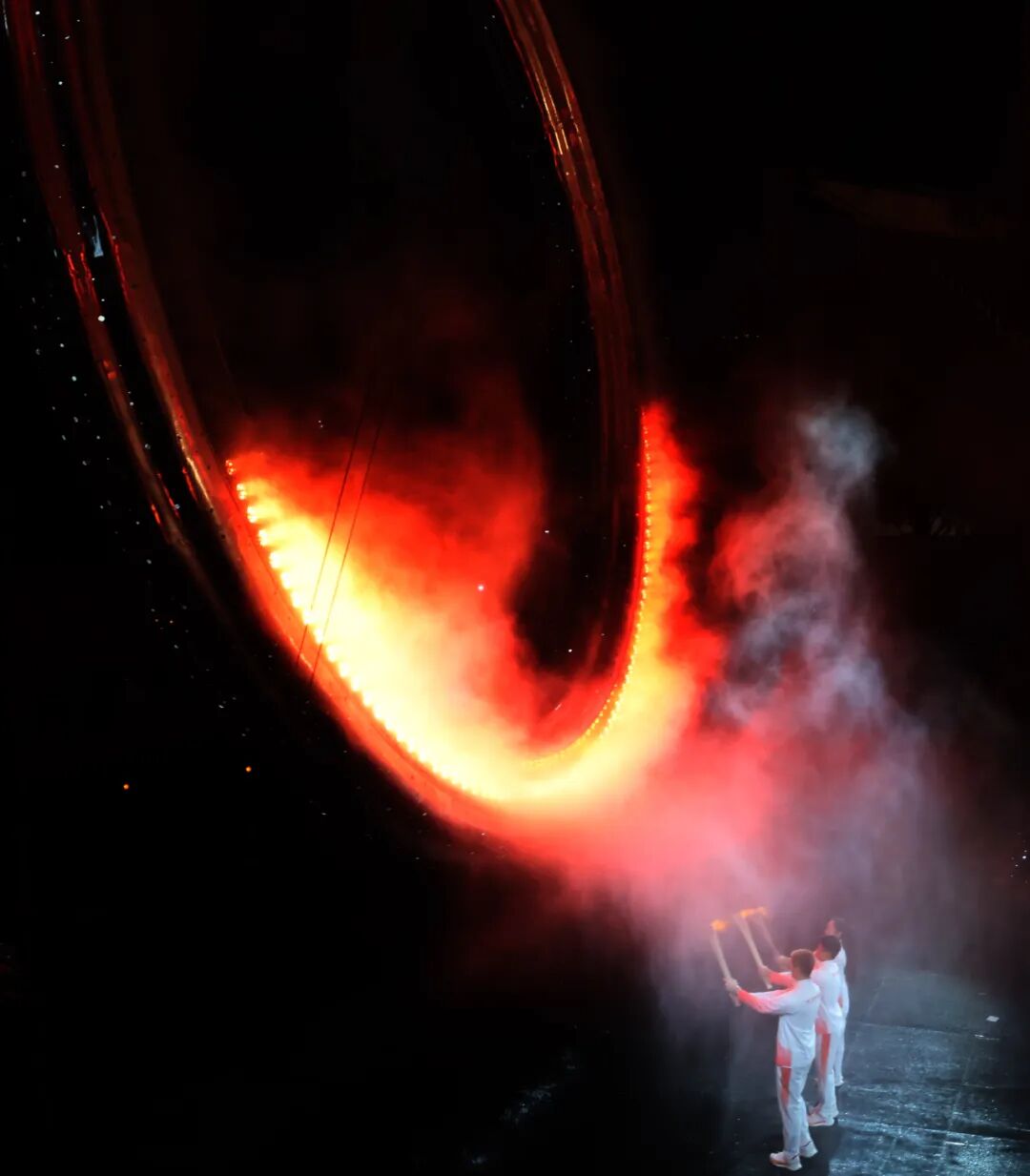 11月9日,火炬手苏炳添(中)、张家朗(左)、李祎点燃主火炬。新华社记者 黄伟 摄