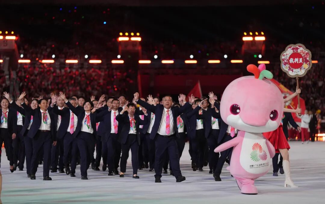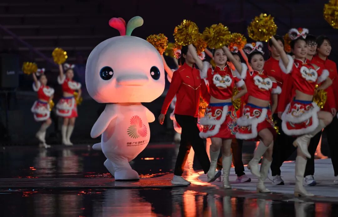 11月9日,第十五届全国运动会吉祥物“喜洋洋”和演员入场。新华社记者 张龙 摄