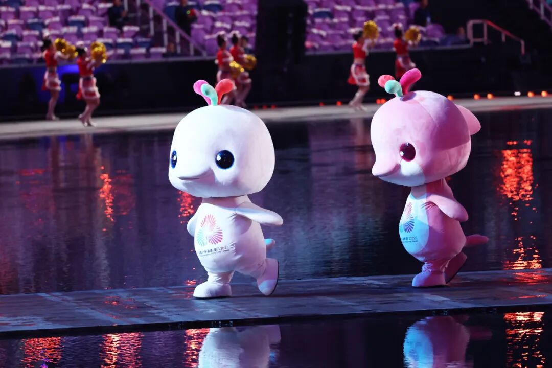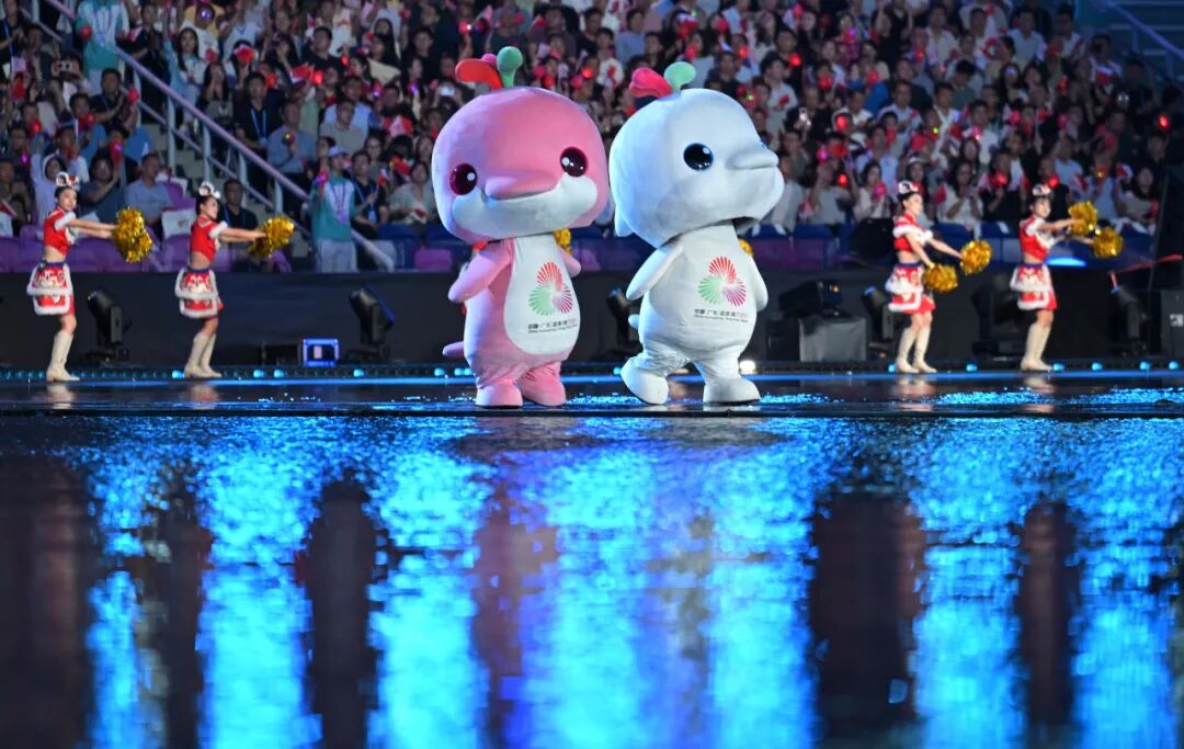 11月9日,第十五届全国运动会吉祥物“喜洋洋”和“乐融融”在开幕式现场表演。新华社记者 雒圆 摄