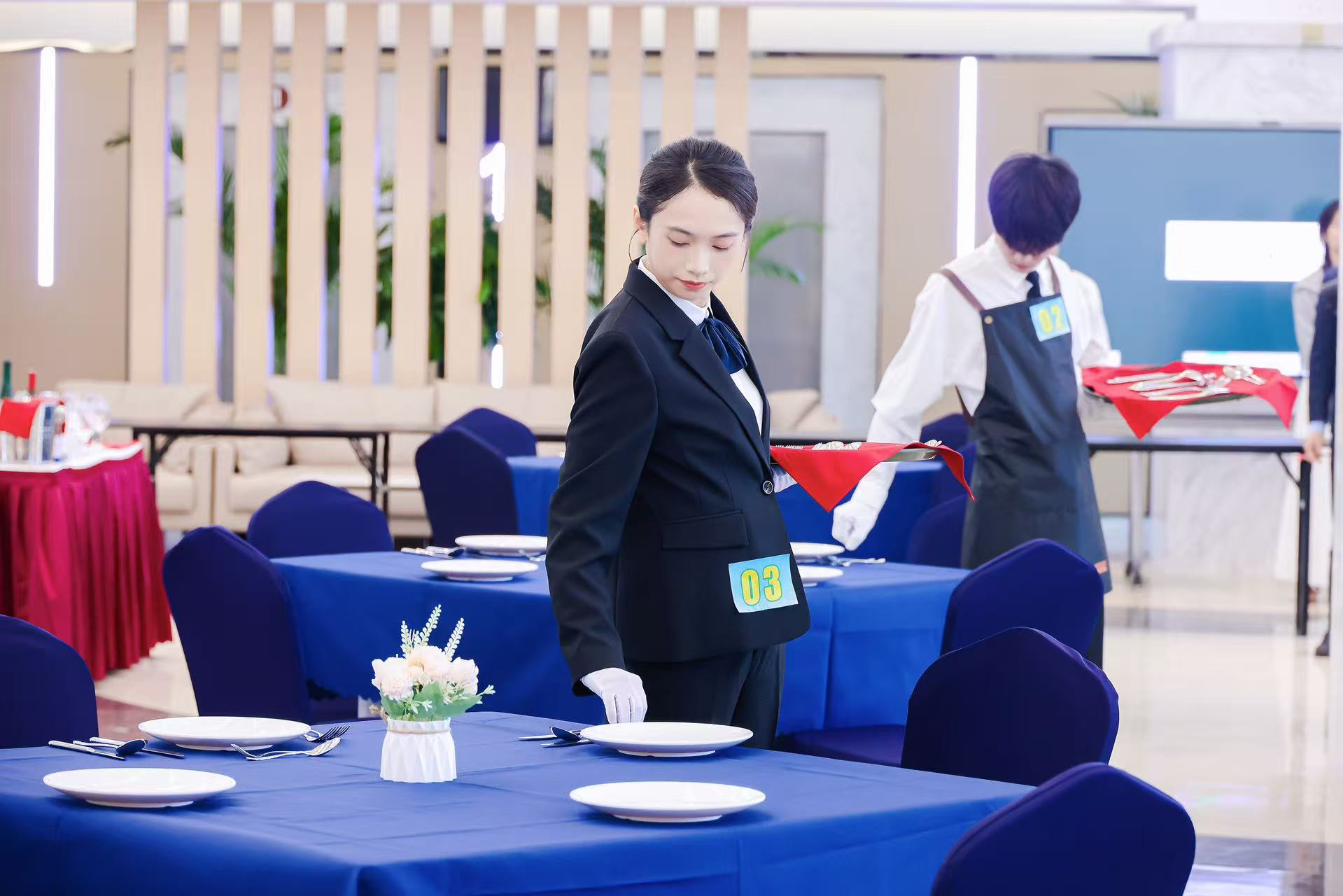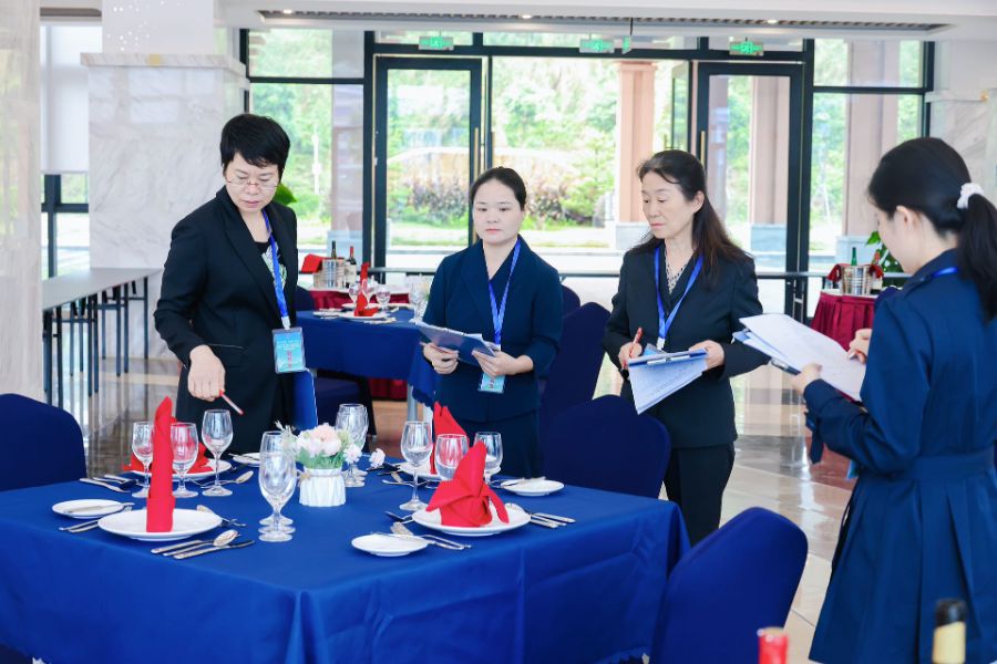 餐厅服务员项目实操模拟西餐宴席场景,要求选手完成席面布置、餐巾折花、酒水服务等任务。选手们在优雅从容的姿态中展现精准的服务节奏,更在酒水服务环节体现出有温度的服务沟通能力与人性化服务意识,充分彰显了现代餐饮服务的专业素养与文化内涵。