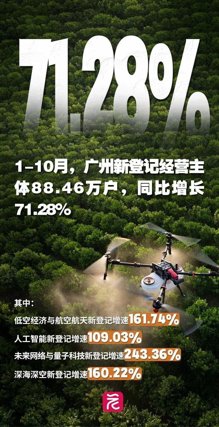 广州经营主体的增长不仅有量的突破,更有质的跃升。今年1—10月,战略性产业集群中, 低空经济与航空航天 新登记增速161.74%、 人工智能 新登记增速109.03%、 时尚消费品 新登记增速100.87%, 三大领域齐头并进 ,尽显战略性产业的强劲爆发力。