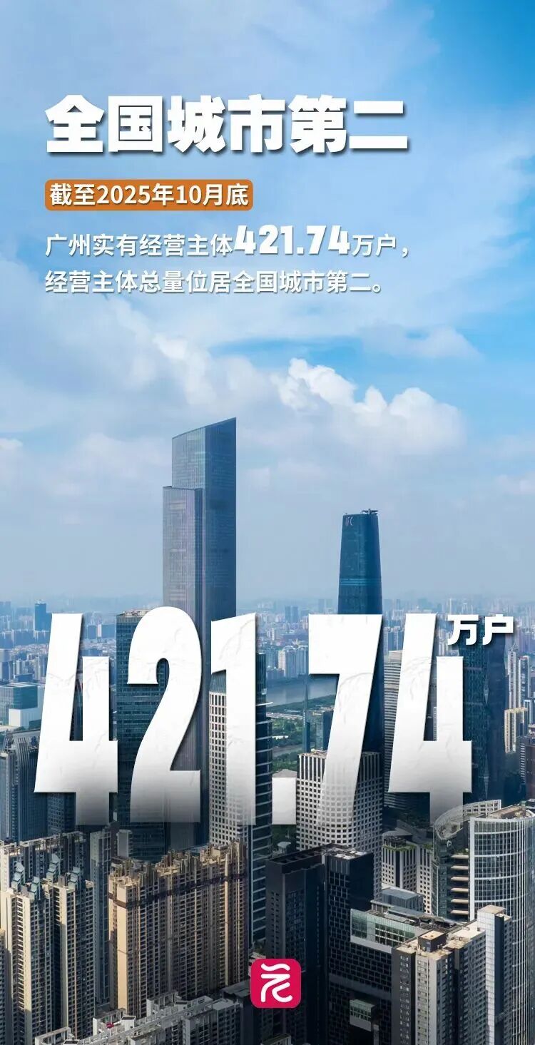 截至2025年10月底,广州经营主体的“家底”再添新分量—— 实有经营主体421.74万户 ,以15.86%的同比增速持续领跑, 经营主体总量跃升全国城市第二。