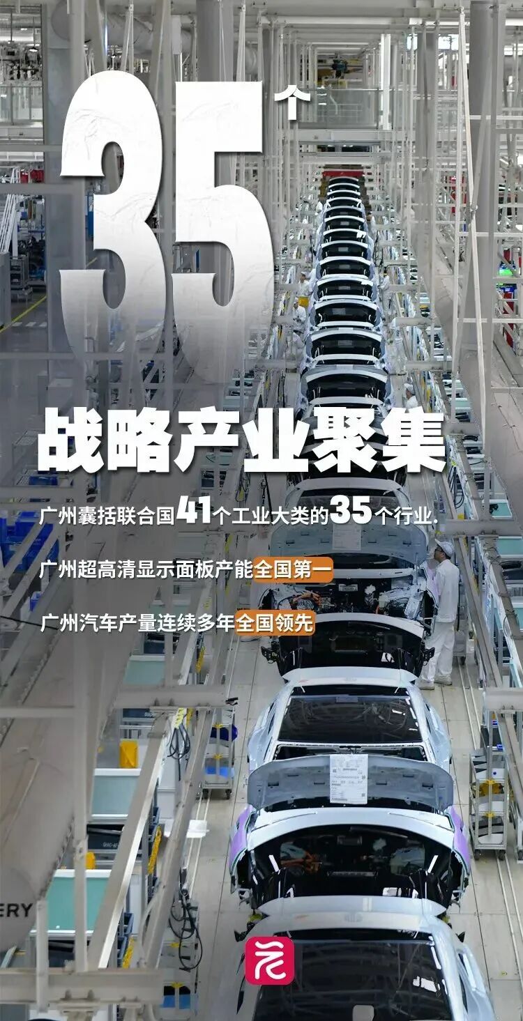 战略产业聚集、 “引力效应”更显著。 作为全国先进制造业基地,广州囊括联合国41个工业大类的35个行业。 广州超高清显示面板产能 全国第一 ,汽车产量连续多年 全国领先 。 消费品工业企业7万多家,生物医药企业总数 全国第三 ,累计368家世界500强企业落户,在穗外资企业超5万家。