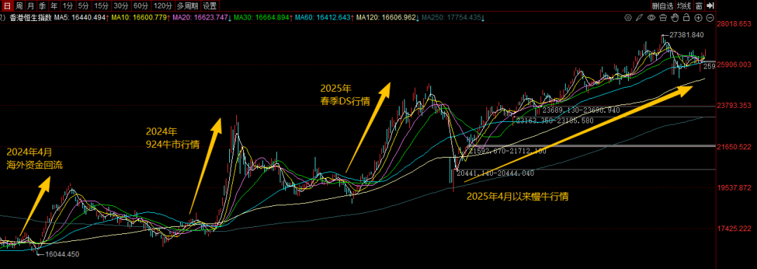 复盘这两年的走势,恒生指数呈现明显的波段牛市。去年4月,因海外资金密集回流,就先于A股走强。