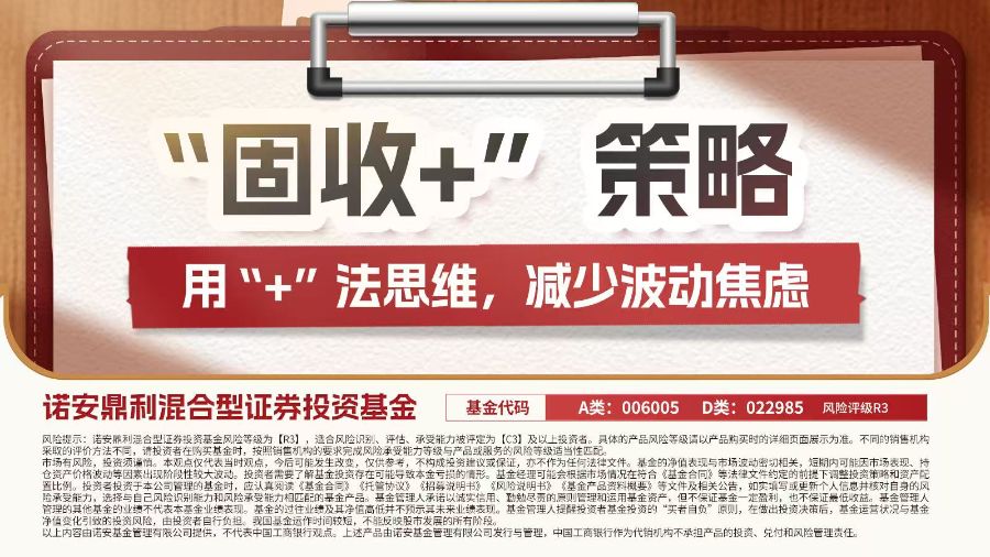 风险提示:诺安鼎利混合型证券投资基金风险等级为R3,适合风险等级为C3及以上投资者,具体的产品风险等级请以产品购买时的详细页面展示为准。不同的销售机构采取的评价方法不同,请投资者在购买基金时,按照销售机构的要求完成风险承受能力等级与产品或服务的风险等级适当性匹配。 市场有风险,投资须谨慎。本观点仅代表当时观点,今后可能发生改变,仅供参考,不构成投资建议或保证,亦不作为任何法律文件。基金的净值表现与市场波动密切相关,短期内可能因市场表现、持仓资产价格波动等因素出现阶段性较大波动。投资者需要了解基金投资存在可能导致本金亏损的情形。基金经理可能会根据市场情况在符合《基金合同》等法律文件约定的前提下调整投资策略和资产配置比例。投资者投资于本公司管理的基金时,应认真阅读《基金合同》《托管协议》《招募说明书》《风险说明书》《基金产品资料概要》等文件及相关公告,如实填写或更新个人信息并核对自身的风险承受能力,选择与自己风险识别能力和风险承受能力相匹配的基金产品。基金管理人承诺以诚实信用、勤勉尽责的原则管理和运用基金资产,但不保证基金一定盈利,也不保证最低收益。基金管理人管理的其他基金的业绩不代表本基金业绩表现。基金的过往业绩及其净值高低并不预示其未来业绩表现。基金管理人提醒投资者基金投资的“买者自负”原则,在做出投资决策后,基金运营状况与基金净值变化引致的投资风险,由投资者自行负担。我国基金运作时间较短,不能反映股市发展的所有阶段。
