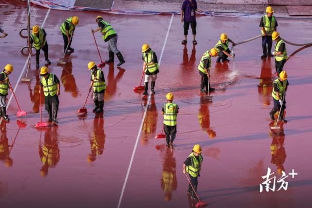 舞台拆除后,广州市重点项目管理中心组织十五运会田径竞委会、奥体中心、第三方检测机构、国际田联认证机构、仪式展演团队、草坪单位、跑道单位等共同对沙坪和跑道进行专业检查和测试,确保其平整度、弹性、防滑性等指标符合国际赛事标准;组织模拟比赛环境下的功能测试,验证场地在实际使用中的稳定与安全性,确保为运动员提供公平、安全的竞赛环境。
