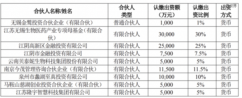 其中,基金最大LP为江苏无锡生物医药产业专项母基金(有限合伙),认缴出资额3亿元,认缴出资比例30%。而为外界所关注的是,贝泰妮也是基金LP之一。