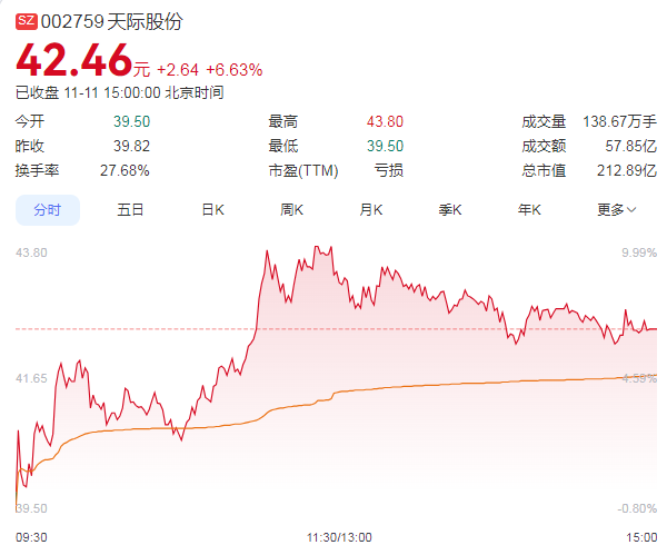 11月11日,天际股份股价表现强劲,盘中触及涨停。截至收盘,股价定格于42.46元,全天成交金额高达57.85亿元,公司总市值攀升至212.89亿元。据统计,自8月29日起至11月11日,在短短47个交易日内,天际股份股价累计涨幅惊人,超过320%。