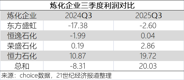 恒逸石化与东方盛虹,前者第三季度完成扭亏,同比增利约2.04亿元;东方盛虹虽仍未扭亏,但第三季度净利润增近15亿元,亏损幅度明显收窄。