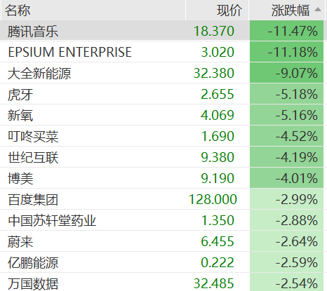 热门中概股多数下跌,纳斯达克金龙中国指数下挫约1.5%。腾讯音乐公布第三季度业绩后,跌超11%,百度跌近3%,蔚来、亿鹏能源、万国数据、阿里巴巴等跌超2%。上涨方面,霸王茶姬涨超5%,亚朵、万物新生涨超3%。