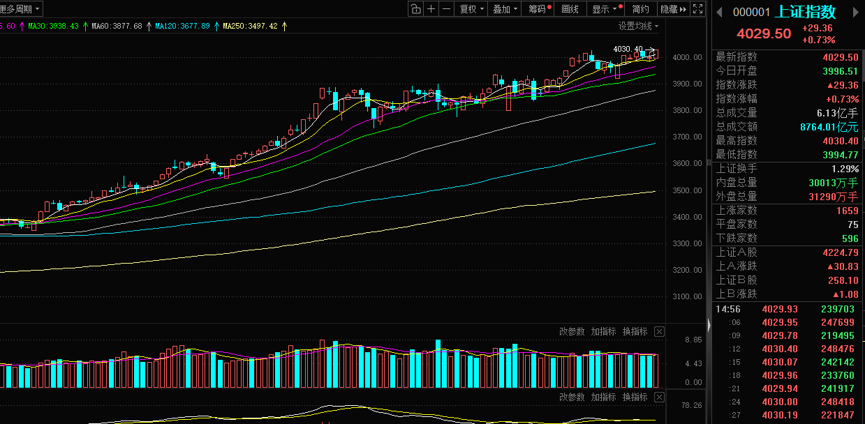 本报讯11月13日,上证综指以4029.50点收盘,较前一交易日上涨0.73%,再度刷新近十年收盘新高。与此同时,深证成指、创业板指分别以1.78%、2.55%的涨幅同步走强,沪深两市成交额突破2万亿元大关,达20420亿元,较前一日放量969亿元。市场分析认为,资本市场的强劲表现,与年内社融增量超30万亿释放的经济稳增长信号形成鲜明呼应,彰显中国经济基本面的坚实支撑。