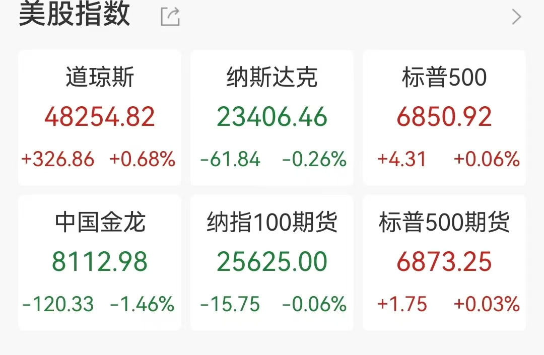 当地时间11月12日,美国三大股指收盘涨跌不一,道指涨0.68%报48254.82点,续创收盘新高。标普500指数涨0.06%,纳指跌0.26%。
