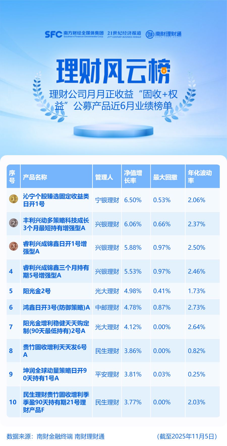 “固收+权益”产品范围为理财公司发行的投资周期在3月以内(含)的公募固收+权益产品,且近6月每个完整的自然月月末均为正收益,统计截止日期为2025年11月5日,统计区间为近6月。