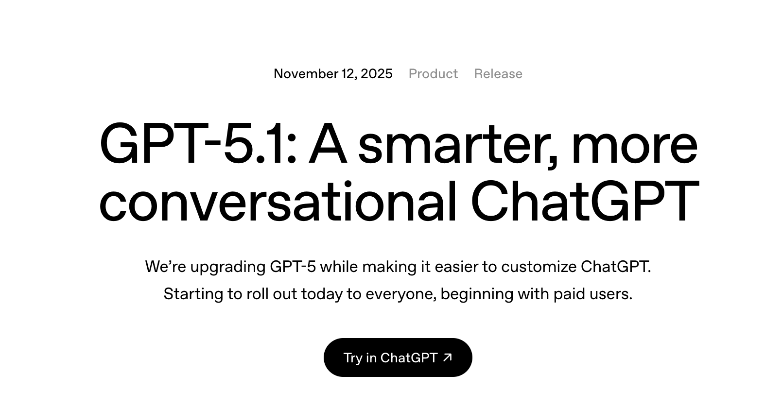 11月12日,OpenAI正式发布GPT-5.1模型,并且首次允许用户细致地调教模型的聊天风格。本次GPT-5.1共发布了两个版本:GPT-5.1 Instant和GPT-5.1 Thinking。GPT-5.1 Instant的特征是,更听话,能更可靠地遵循用户的指令;同时可以自适应推理(Adaptive Reasoning),这是Instant模型第一次引入该功能。GPT-5.1 Thinking则注重效率提升,能更精准地分配思考时间;同时更易懂,使用了更少的行业术语和未定义的词汇;默认基调也更温暖、更富同理心。