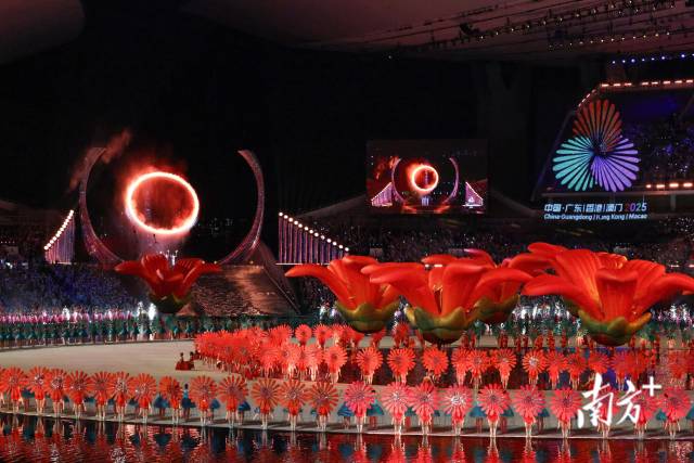 11月9日晚,第十五届全国运动会开幕式上,来自粤港澳的三位火炬手同时擎起火炬,踏浪登台点燃火环,三根支柱由外弯转为内弯,稳稳托举火环,形成“三地同心,中华梦圆”的精彩画面,点燃大湾区深度交融的新篇章。