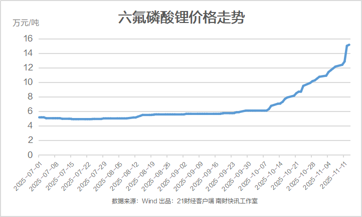 数据显示,六氟磷酸锂从7月15日的4.93万元/吨上涨至15.15万元/吨,涨幅超200%。此前锂电产业链股价受益由此推动。