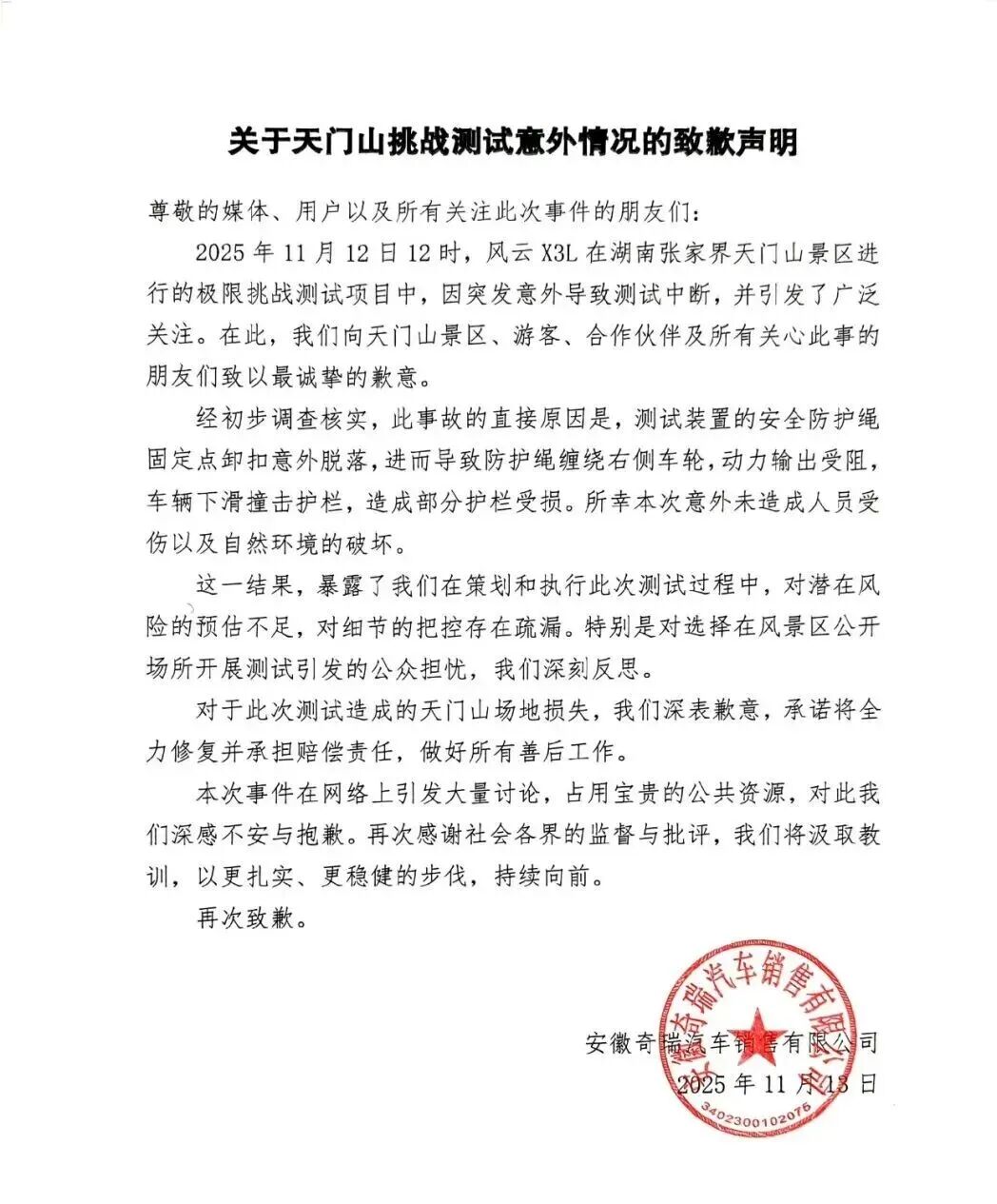声明称,2025年11月12日12时,风云X3L在湖南张家界天门山景区进行的极限挑战测试项目中,因突发意外导致测试中断,并引发了广泛关注。在此,我们向天门山景区、游客、合作伙伴及所有关心此事的朋友们致以最诚挚的歉意。