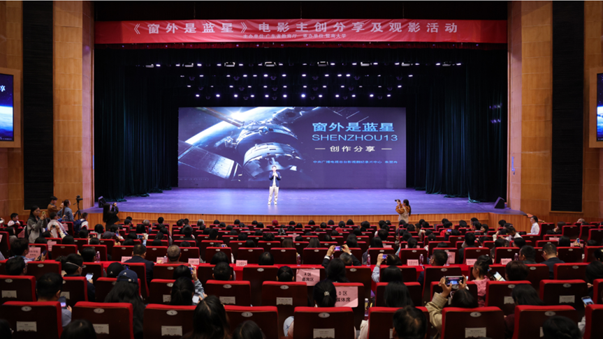 活动现场,暨南大学及暨南大学附属中学、附属小学1400余名学生共同观影,沉浸在《窗外是蓝星》的浩瀚星空。