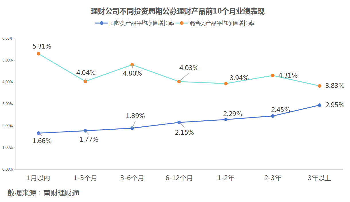 从不同投资周期业绩来看,混合类产品的总体业绩表现均优于同期限固收类产品。1月以内投资周期的混合类产品前10个月平均净值增长率最高,达5.31%。固收类产品总体随着投资周期拉长收益率走高,3年以上投资周期前10个月平均净值增长率达2.95%,1月以内则低至1.66%。
