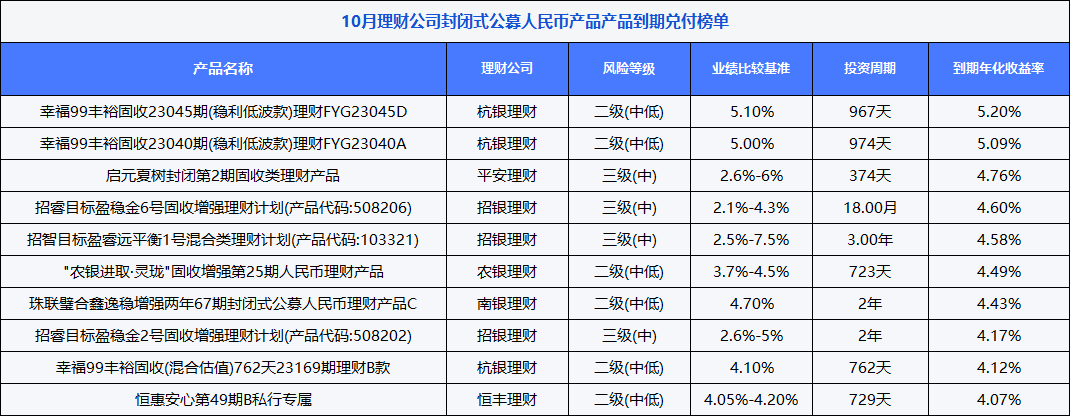 榜单:在10月理财公司封闭式公募理财到期兑付榜单中(注:同系列产品仅取一只,投资币种为人民币),6家理财公司产品上榜,杭银理财、招银理财各上榜3只产品。杭银理财两只固收产品到期年化收益率超5%,位列前二。