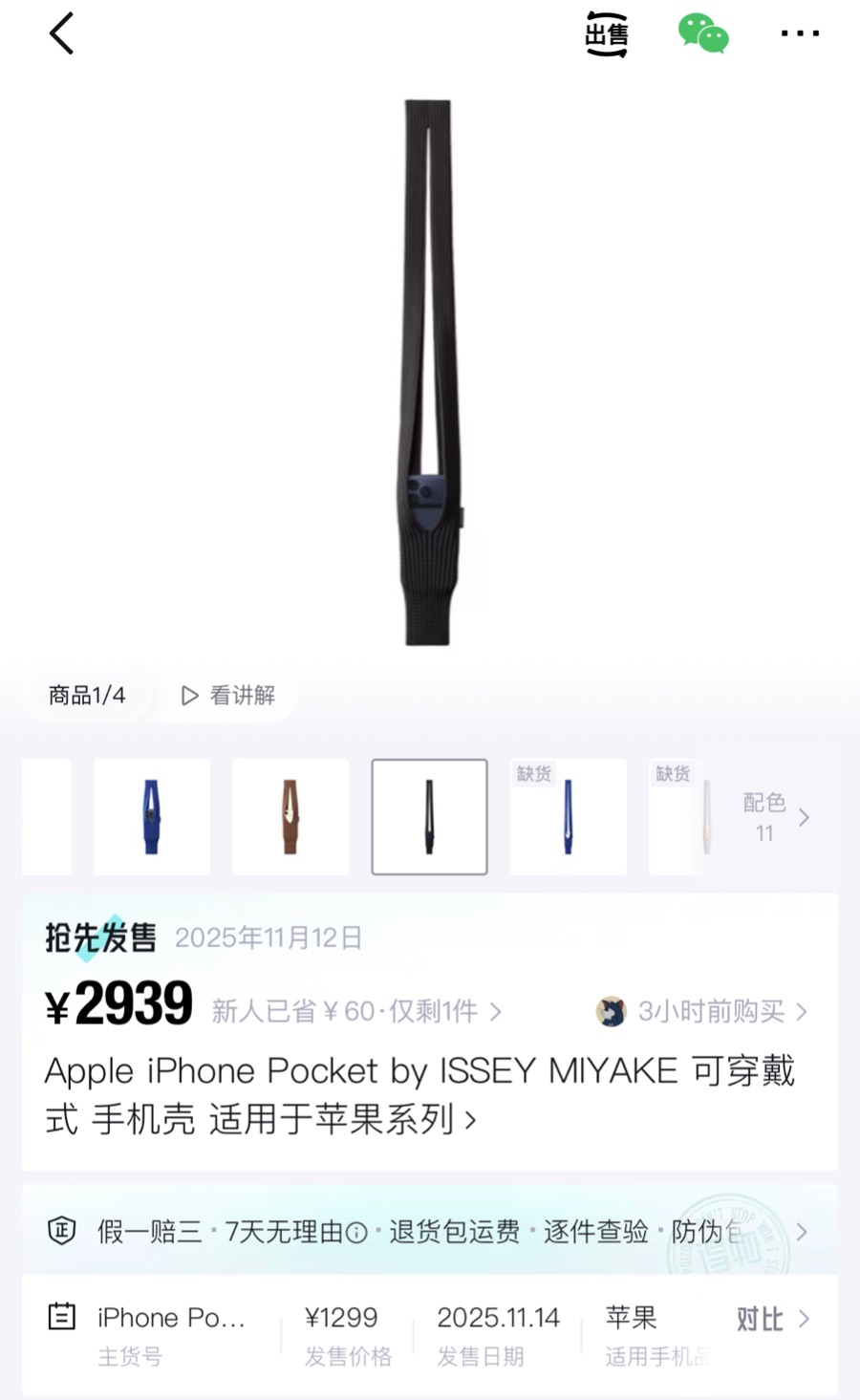 11月14日,苹果与三宅一生(ISSEY MIYAKE)联合推出的全新配件iPhone Pocket正式开售,短带款售价1299元、长带款售价1899元。中国大陆仅在上海Apple静安零售店和苹果官网有售。