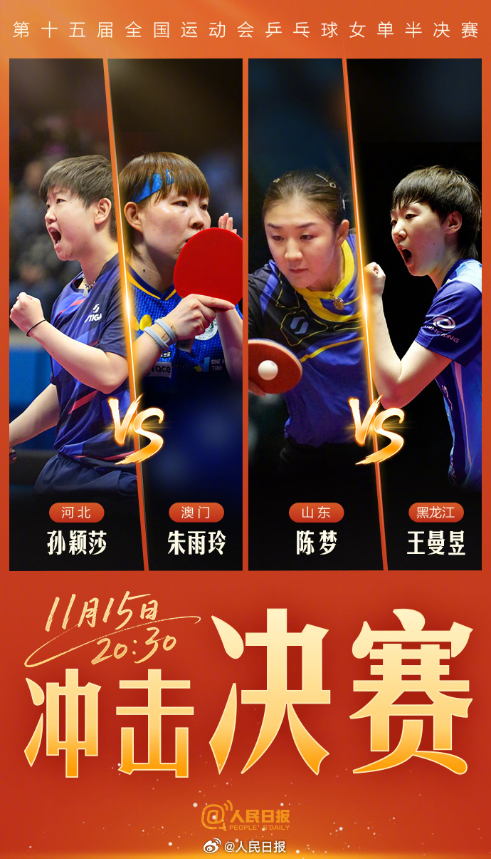 今晚20:30,第十五届全国运动会乒乓球女单半决赛将进行,孙颖莎VS朱雨玲,陈梦VS王曼昱,期待运动员的精彩表现!