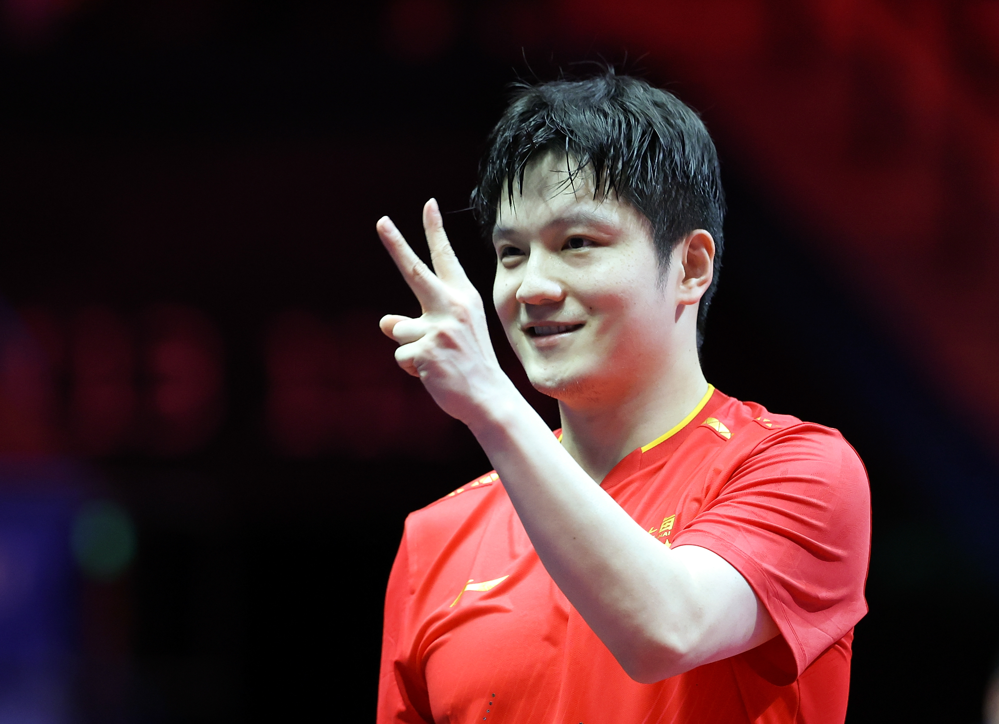 比赛结束,樊振东像巴黎奥运会夺冠那般,再次做出了球星姆巴佩的庆祝动作。之后,他转过身,面对由无数手机亮光组成的看台,微笑着挥手。