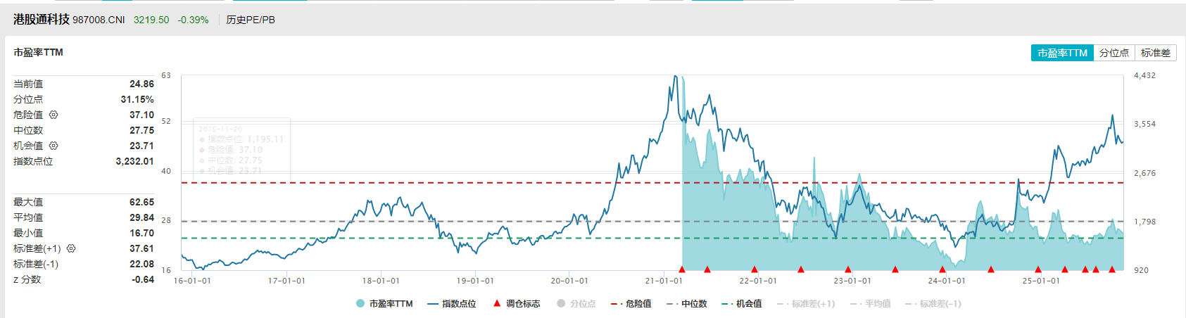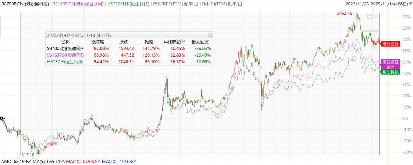 据Wind数据,自2024年初以来至2025年11月14日,港股通科技指数累涨超87%,同期港股通互联网指数、恒生科技指数涨69%、54%。估值层面看,港股通科技指数最新估值24.86倍PE-TTM,处于31%历史分位数。