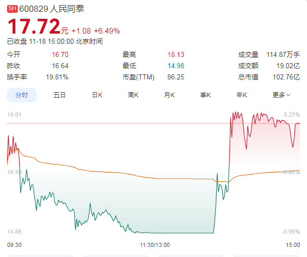 11月18日,人民同泰延续近期强势表现,盘中股价再度冲高。截至收盘,该股报17.72元,总市值达102.76亿元。数据显示,自10月28日以来,该股在短短16个交易日内累计涨幅已超116%,表现十分亮眼。