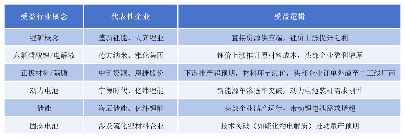综合看来,锂矿涨价将直接利好锂矿概念板块、上游原材料(如六氟磷酸锂、电解液)、中游电池材料(如正极材料、隔膜)、下游动力电池和储能行业,同时固态电池技术突破可能带来新增长点。