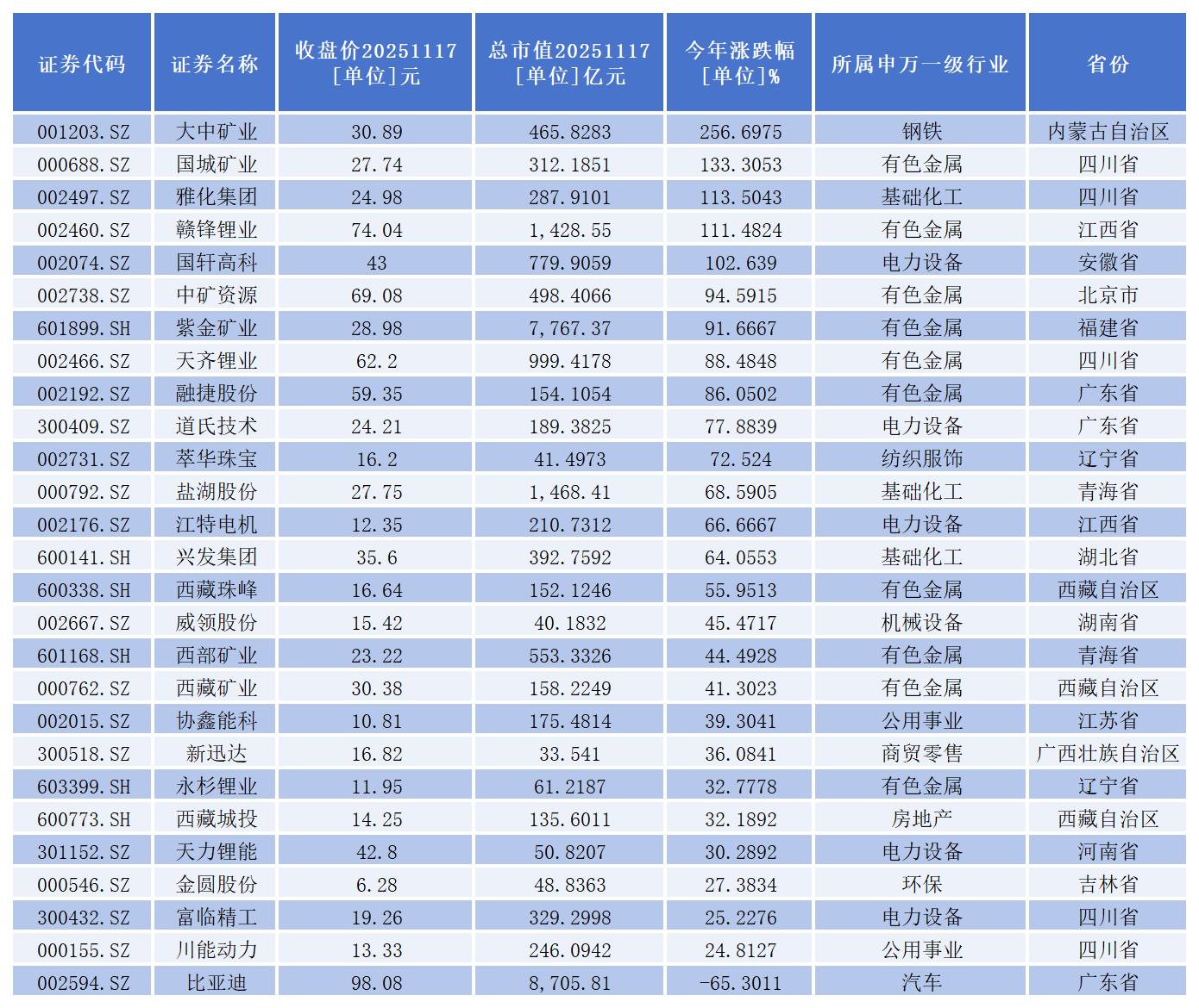 从二级市场表现看,今年以来,截至11月17日收盘,26家股价出现上涨。其中大中矿业、国城矿业、雅化集团、赣锋锂业、国轩高科5家公司股价成功实现翻倍。