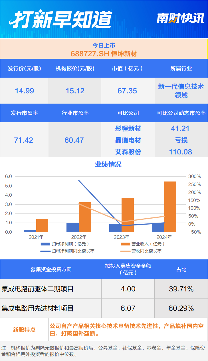 11月18日,有一只新股申购,为北交所的精创电气(920035.BJ);有三只新股上市,为创业板的南网数字(301638.SZ),科创板的恒坤新材(688727.SH),以及北交所的北矿检测(920160.BJ )。