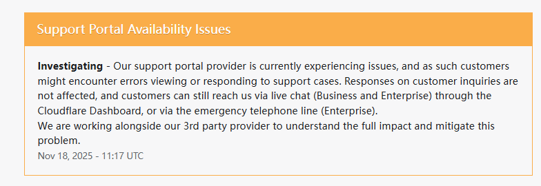 北京时间19:17(伦敦时间11:17), Cloudflare官网状态显示其支持的门户提供商目前遇到一些问题,因此客户查看或回复支持案例时可能会遇到错误。