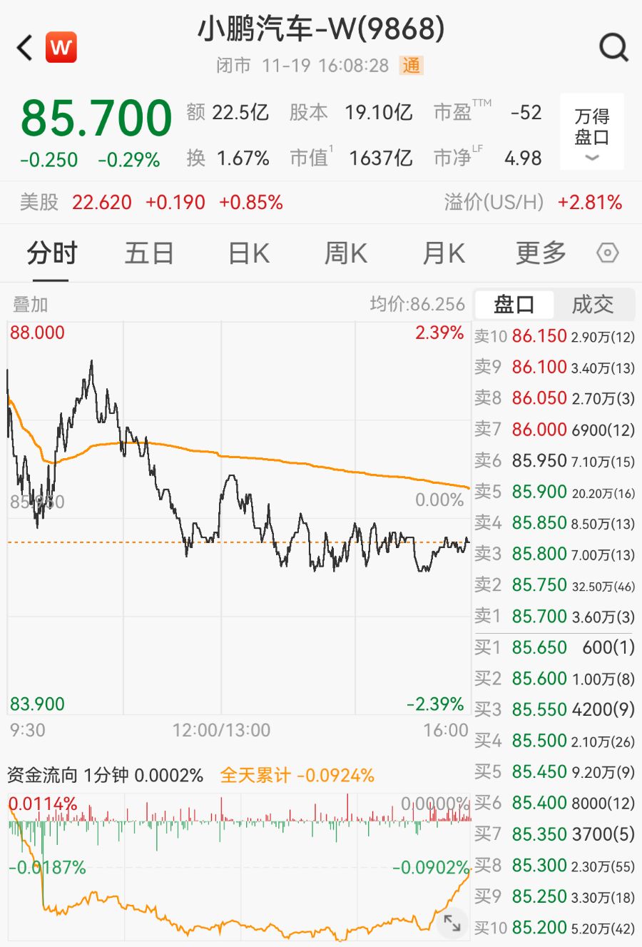 11月19日,小鹏汽车港股盘中窄幅震荡,报收85.70港元/股,跌0.29%,总市值为1637亿港元。