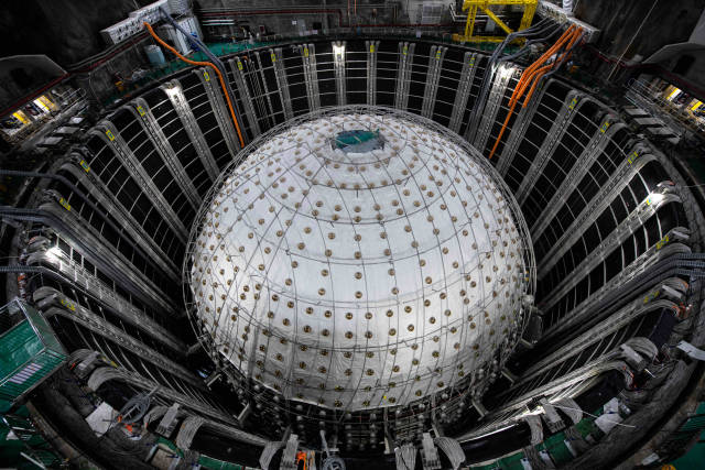 其主体结构为直径41.1米的不锈钢网壳,承载着包括直径35.4米的有机玻璃球、2万吨液体闪烁体、45000只光电倍增管等在内的众多关键部件,共同构起超高灵敏度的中微子探测系统。