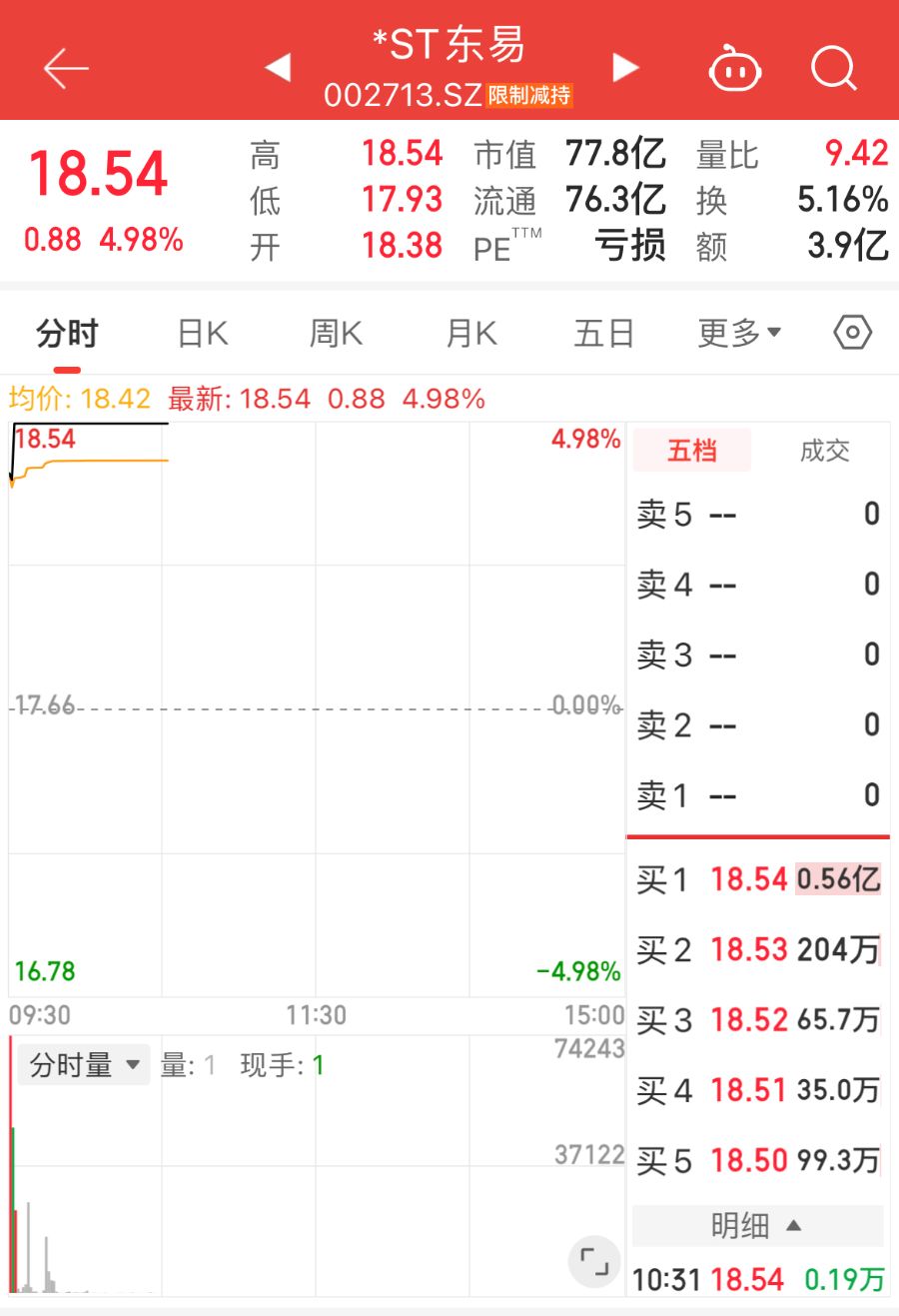 11月19日,曾被誉为“家装第一股”的*ST东易(东易日盛,002713.SZ)复牌后开盘不久再度涨停,截至10时33分,报18.54元/股,涨停板上封板资金0.56亿元。这是该公司在30个交易日里收获的第24个涨停板,至此,自9月26日以来,其股价累计涨幅已高达255.85%。