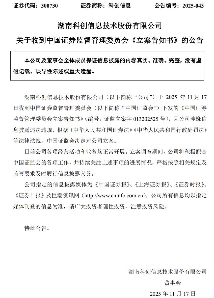 一场立案调查,让湖南科创信息技术股份有限公司(科创信息,证券代码:300730)引发市场关注。11月17日晚间,科创信息公告披露,因涉嫌信息披露违法违规,已收到中国证券监督管理委员会《立案告知书》,监管部门将依相关法规开展调查。消息引发市场震荡,11月18日公司股价19.99%跌停,报14.41元/股,总市值缩水至34.75亿元。